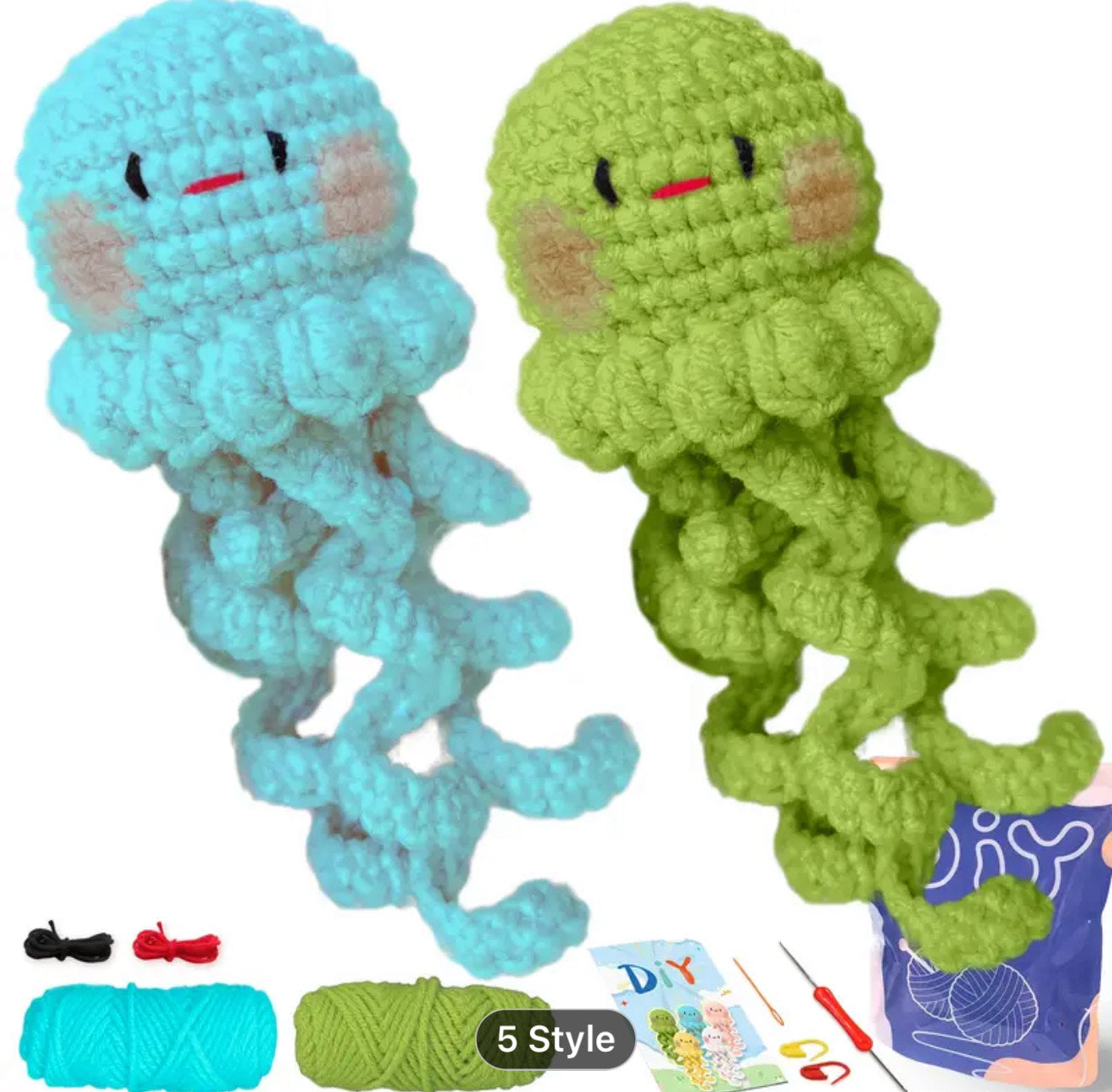 Crochet these fabulously cute jellyfish. There are two colourways available, yellow/blue and blue/green. We will pick for you, unless noted otherwise.