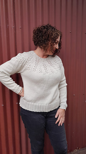 Church Windows is a top-down seamless yoke jersey. The neck band is cast on and a cable and rib pattern is worked for the neckband. The yoke is then worked down with lace panels and stitches are increased quickly to form the arches which shape the yoke. German Short Rows are worked in the back yoke to push it up for a better fit. Once the yoke is complete, the sleeves are separated off and the body is worked down straight and finished with the cable and rib hem. The sleeves are returned to the needles and underarm stitches are picked up before being worked down with decreases to a full length.