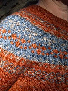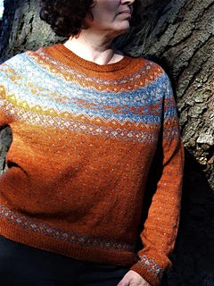 Evening Shadows is an all over colour-work, top-down, seamless, yoked sweater with long sleeves. The yoke is cast on and worked down, the increases are worked in the stockinette sections around the colour-work. Once the sleeves are separated, the fun does not stop with a wonderfully easy and effective colour-work pattern worked on the straight body. A simple rib finishes it. The sleeves are placed back on the needles and the colour-work is worked down the long sleeve with concurrent decreases, then a simple rib. The neckband is picked up and finished again with the simple rib.