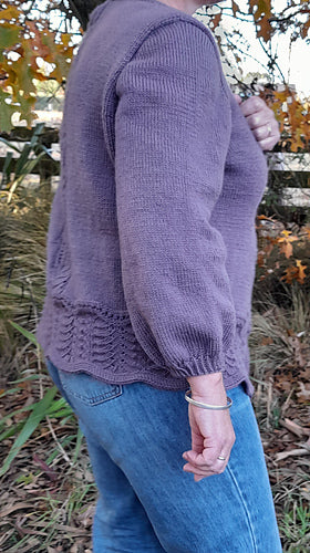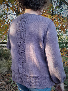 First Frost is cast on along the back and short rows shape the shoulders and neck, before knitting down to the armhole with shaping. The lace pattern is worked into the centre back. The fronts are picked up along the back shoulders, and have short row shaping and increases to shape the neckline. The lace pattern is worked down each front edge to the underarm, with shaping for the armholes. The back and fronts are joined so the body is knit down in one piece, working flat and with the lace pattern continuing. The body then has a garter and eyelet section worked in and then the wide lace border. The sleeves are picked up around the armhole and a short row sleeve cap is worked. There are no decreases in the sleeves until just short of the bracelet length (easily made to desired length), when a decrease round is worked before a small twisted rib cuff finishes them. The neckband is picked up around the neckline and a garter stitch band is worked. The button bands are also picked up and worked in garter stitch. Finally, buttons are sown on.
