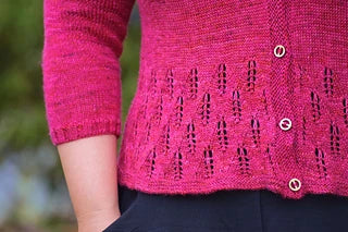 Forest Walking is a saddle shoulder cardigan with gathers on the fronts flowing down to a softly A-line body. The two saddles are worked, then the back is picked up and worked down to the bottom of the armhole with shaping. The fronts are picked up along the saddles and increases worked to form the gathers, with no shaping down to the armhole until under the arm is cast on. The body is joined and worked down in stockinette with some increases through the back for the A-line then a section of lace representing the forest is worked, before being finished with a small garter hem. The sleeves are picked up and a short row sleeve cap is worked before the bracelet length sleeve is worked down with decrease shaping and finished with a small rib cuff. Finally, the whole front and neck band is picked up and worked in garter stitch with button holes before being bound off.