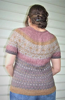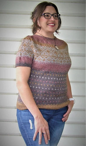 The Māia top is a top-down seamless yoked short sleeve top. The yoke is cast on and worked down, the increases are worked in the stockinette sections around the colour-work. Once the sleeves are separated, the fun does not stop with a wonderfully easy and effective colour-work pattern worked on the straight body. A simple rib finishes it. The sleeves are placed back on the needles and a short colour-work section precedes either a long or short sleeve option before a simple rib is worked. The neckband is picked up and finished again with the simple rib and then bound off using a contrast colour.