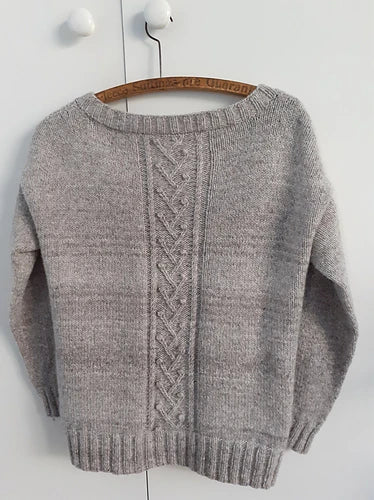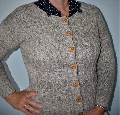 The Motuiti cardigan is a modified drop shoulder cardigan worked seamlessly from the bottom up. It is cast on at the bottom and a rib hem is worked before the cable pattern is introduced and worked up the body to the underarm. The front and back are separated at the underarm and worked separately up to the shoulders with shaping for the neckline and short rows for the shoulders. The front and back shoulders are joined with a three-needle bind-off. The sleeves are picked up and worked down with decreases to a ribbed cuff. Finally, the neckband then button bands are picked and worked in rib.
