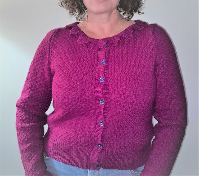 The Tiffany Cardigan has a set-in sleeve worked from the bottom up. It is cast on at the bottom and a rib hem is worked before the texture pattern is introduced and is worked up the body to the underarm. The front and back are separated at the underarm and worked separately up to the shoulders with shaping for the armhole and neckline and German Short rows for the shoulders. The front and back shoulders are joined with a three-needle bind-off. The sleeves are knit flat from the cuff up with increases and shaping for a sleeve cap, before sewing them in place. Button bands are added and then finally the collar is knit sideways separately and then sewn in place around the neck edge. Alternatively, a simple rib neckband can be worked. The cardigan requires blocking paying attention to the collar and finally seven buttons are sewn on.