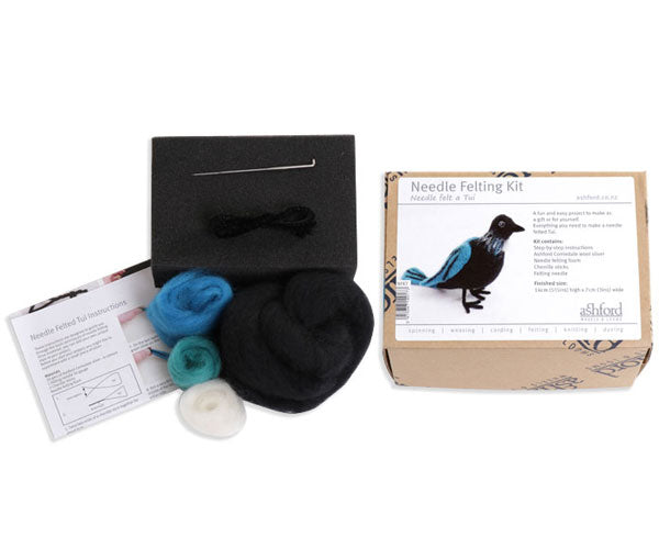 Each kit includes: 1 felting needle, enough fibre for 1 felted animal, chenille sticks (Kiwi, Tui, Pukeko), foam block and full step-by-step colour instructions.