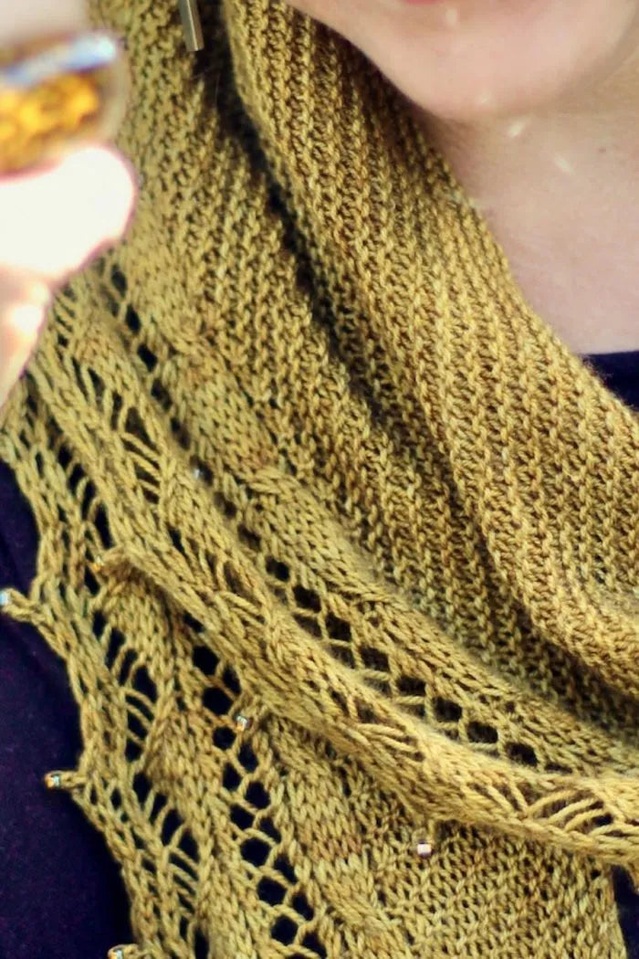 The pattern includes a clear explanation of making adjustments for a longer or shorter shawl and easily accommodates different skein lengths. It also contains a link to a helpful tutorial demonstrating how to add beads to your Bejewelled shawl.