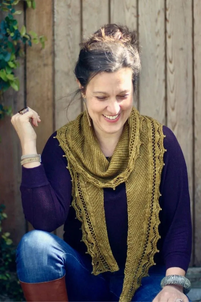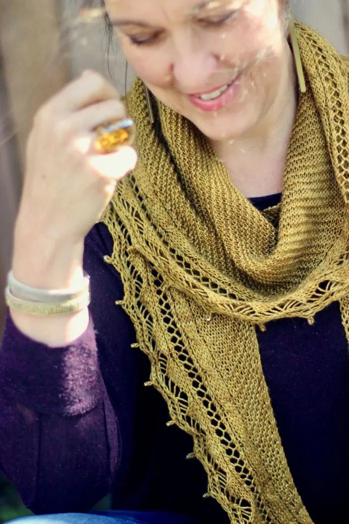 You’ll feel special wearing Bejewelled – she’s a great excuse to adorn yourself with your creative knitting instead of necklaces. Using fingering-weight yarn, Bejewelled is a long, slender, crescent-shaped shawl that glides around your neck.