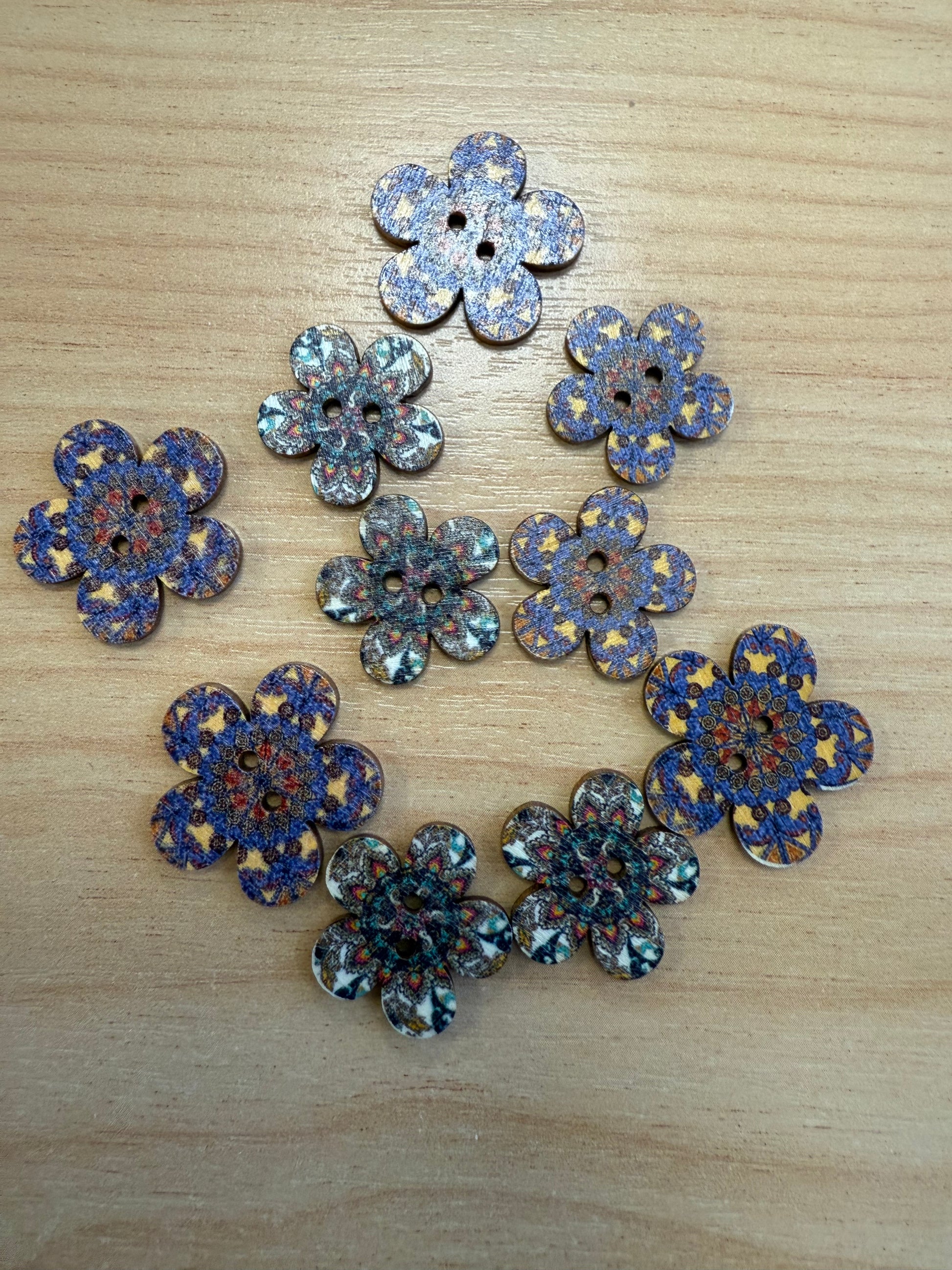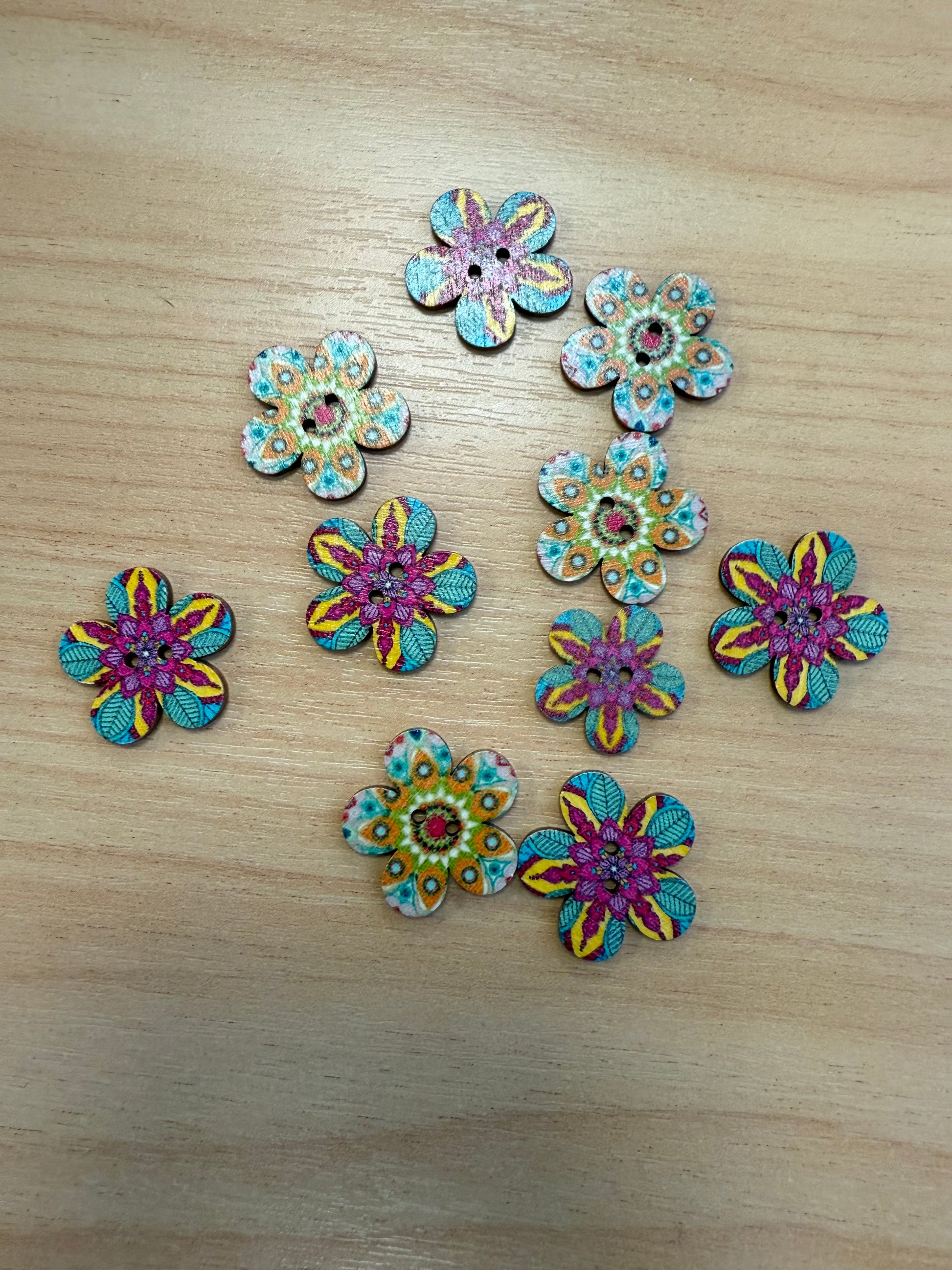 Buttons - Boho Wooden Flowers 20mm x 10 Mixed