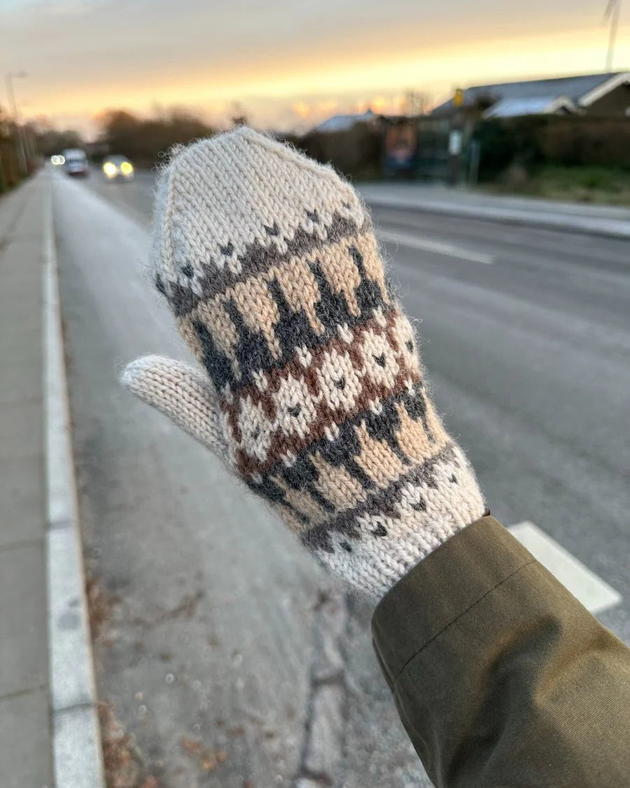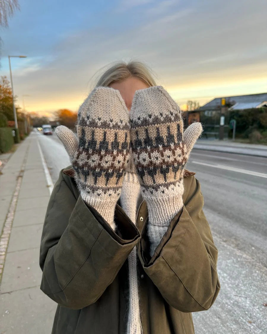 The white Celeste Mittens are knitted in Peer Gynt by Sandnes Garn in the colors Muskat melange [3070], Charcoal melange [1065], Mellombrun melert [2652], Shell melange [2710] and Almond [2511].