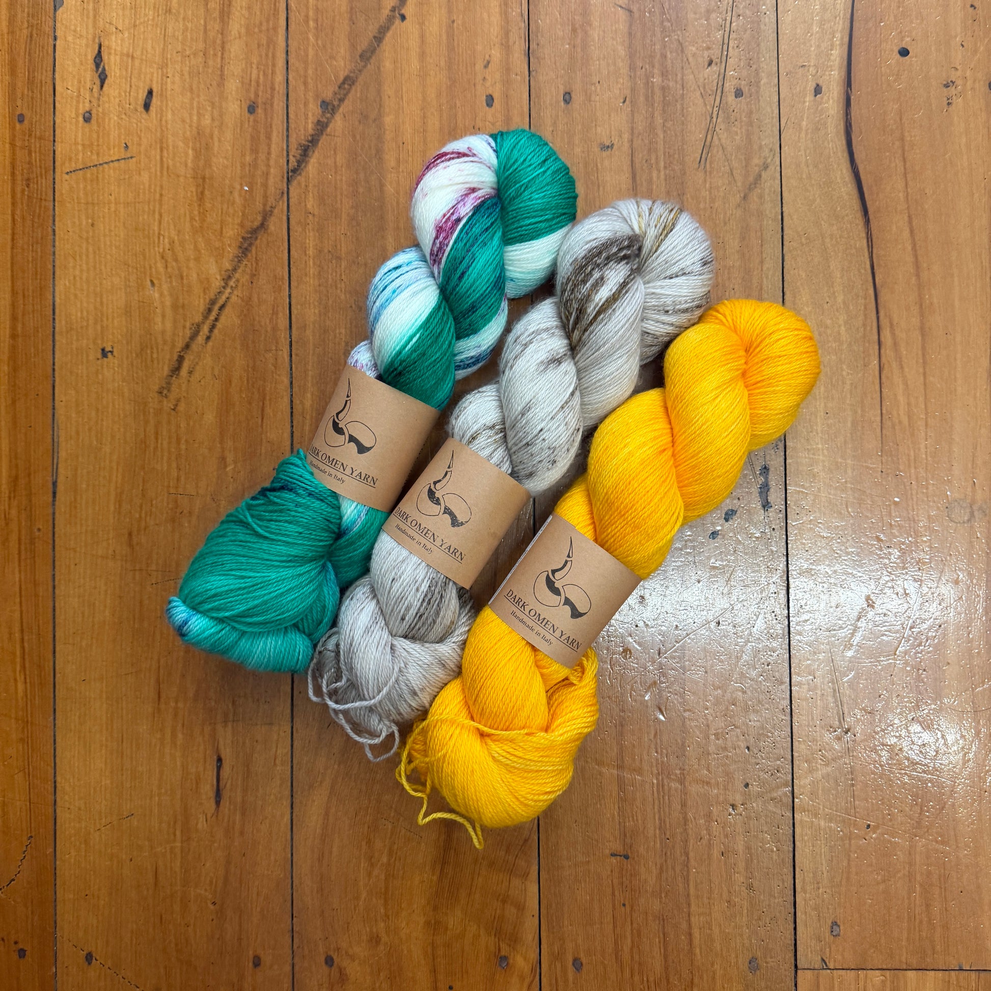 - Three 100g skeins of Merino Plus (100% superwash merino, approx. 400m each)