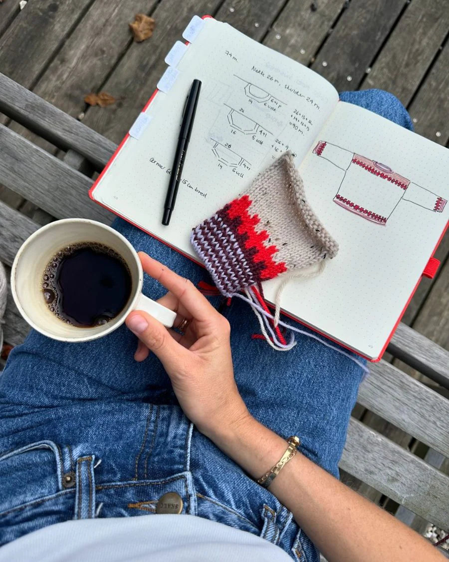 The Cross Sweater Junior is designed to have approx. 25 cm [9¾ inches] of positive ease. The sizes 1-2 (2-3) 3-4 (4-5) 5-6 (6-7) 7-8 (8-9) 9-10 (10-11) 11-12 (12-14) years are designed to fit a chest circumference of 53 (54) 56 (57) 59 (62) 64 (68) 72 (75) 78 (82) cm [20¾ (21¼) 22 (22½) 23¼ (24½) 25¼ (26¾) 28¼ (29½) 30¾ (32¼) inches]. The measurements for the finished sweater can be found on the front page of the pattern (please note that these measurements are only achieved if the correct gauge is maintained). If the intended wearer of the sweater measures 62 cm [24½ inches] around the chest, for example, you should knit a size 6-7 years. A sweater in size 6-7 years has a chest circumference of 88 cm [34¾ inches] which in the given example would you 26 cm [10¼ inches] of positive ease. If the measured chest circumference deviates from the age guide, you can adjust the length to fit the intended wearer. The same applies if the intended wearer is shorter or taller than average. Schematics can be found here.