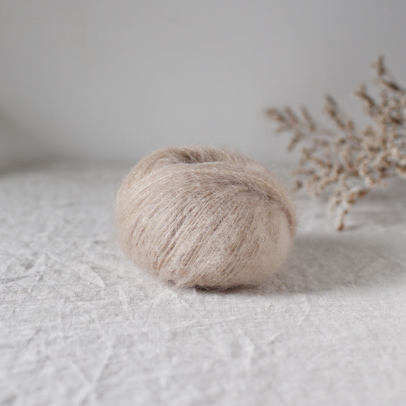 Bérénice is a unique blend of extra-fine Angora goat fibres from South African farms committed to animal welfare and the soft, plump wool of our organic Merinos d'Arles, spun into loops around a strong, shiny silk yarn, then combed to give the desired tousled, voluminous look.