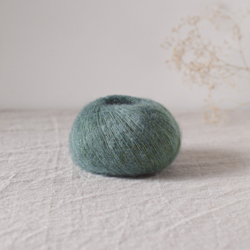 Bérénice is a unique blend of extra-fine Angora goat fibres from South African farms committed to animal welfare and the soft, plump wool of our organic Merinos d'Arles, spun into loops around a strong, shiny silk yarn, then combed to give the desired tousled, voluminous look.