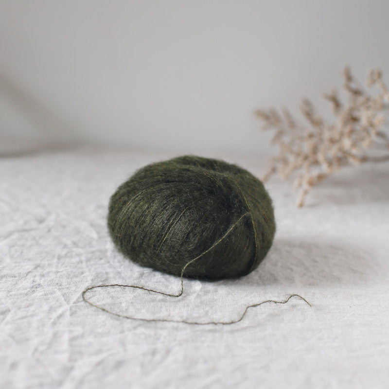 Bérénice is a unique blend of extra-fine Angora goat fibres from South African farms committed to animal welfare and the soft, plump wool of our organic Merinos d'Arles, spun into loops around a strong, shiny silk yarn, then combed to give the desired tousled, voluminous look.