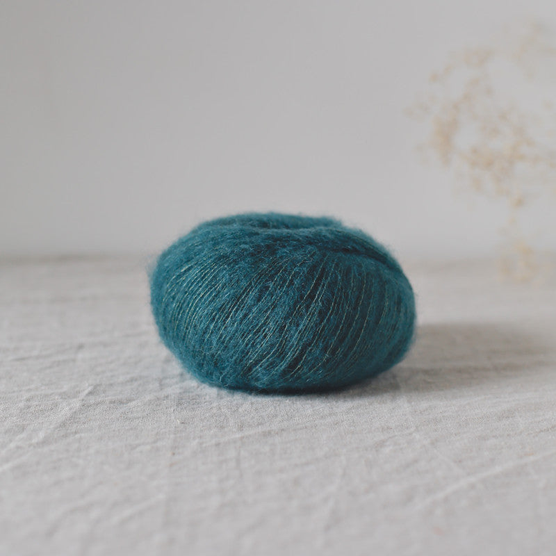 Bérénice is a unique blend of extra-fine Angora goat fibres from South African farms committed to animal welfare and the soft, plump wool of our organic Merinos d'Arles, spun into loops around a strong, shiny silk yarn, then combed to give the desired tousled, voluminous look.