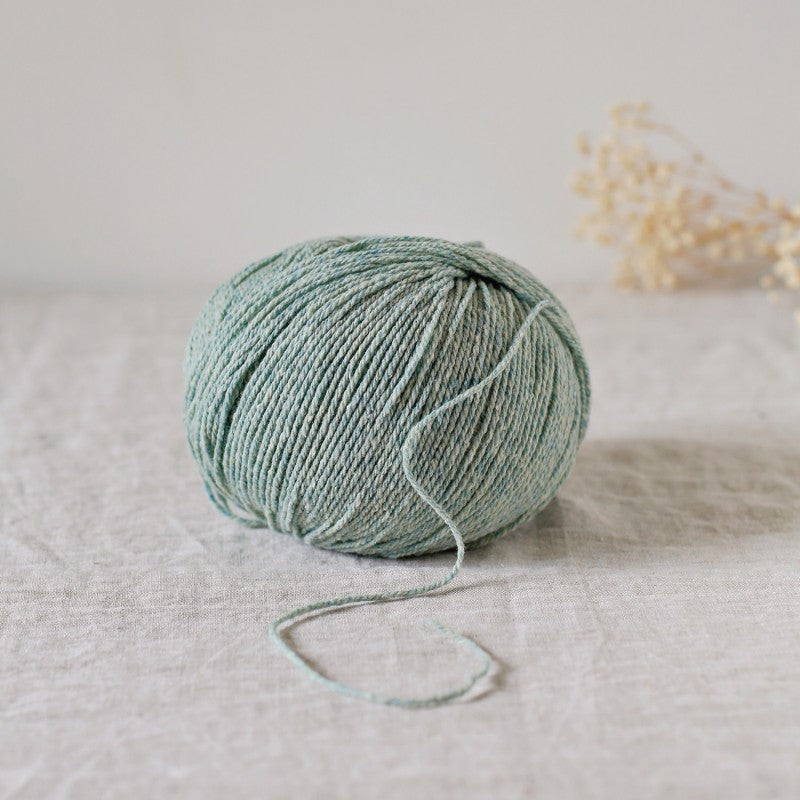 The presence of cotton in its composition gives it a little more softness, a fresher feel and more compactness than its pure wool brother. The small cotton flakes give it an original texture and create a mottled look, more or less pronounced depending on the colour. It is a rather dry yarn which, like many woolen spun yarns, gains in softness and fluffiness once washed.
