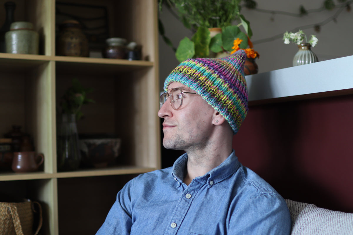 A delightfully squishy hat that is quick to make and fun to wear. If you have extra yarn you could also top it off with a pompom!
