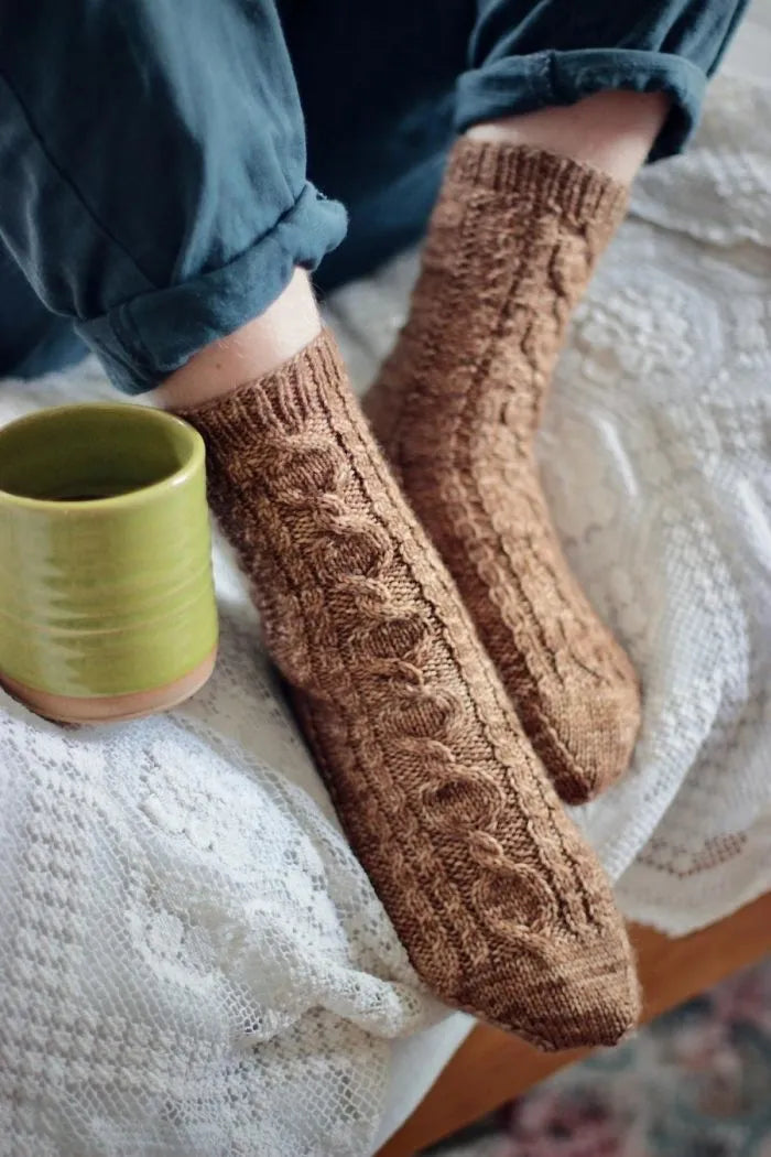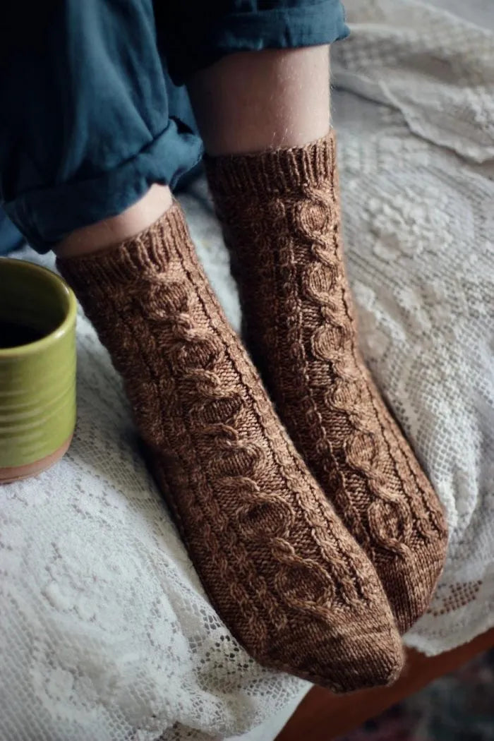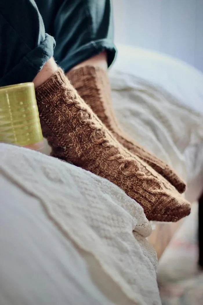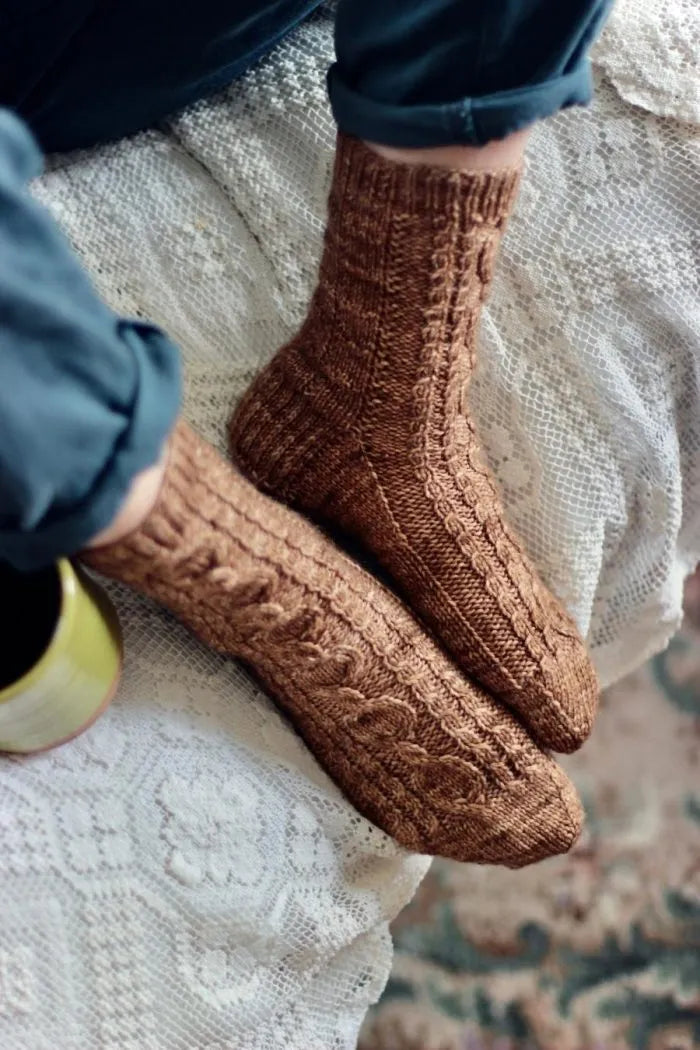 Begin at the top and wind your way down Florence’s striking cables and over her quilted leg. You’ll create a comfy heel flap before turning the corner, and hey presto! Quickly finding yourself choosing between two fantastic toes to finish.