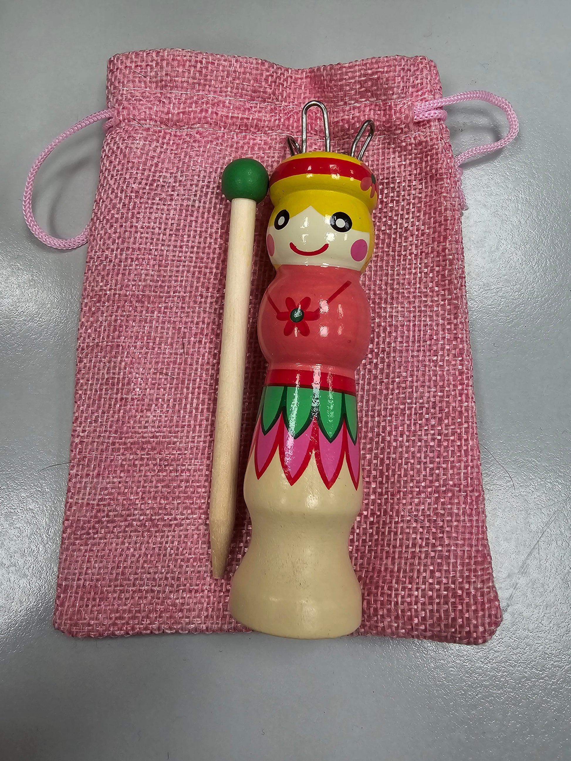 Old school wooden french knitting doll. Comes in a cute pink bag with a wooden needle.