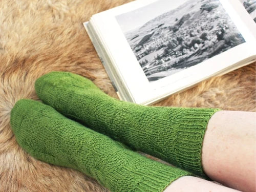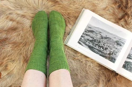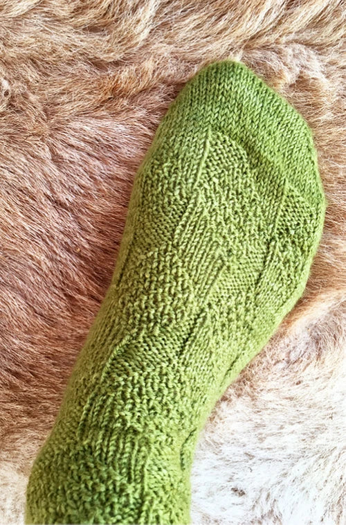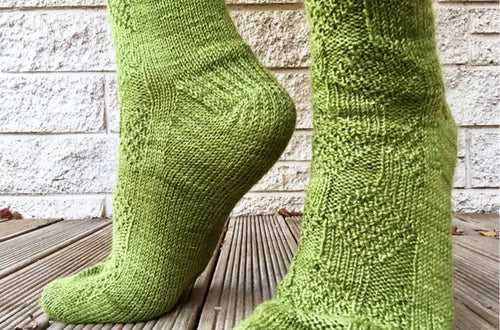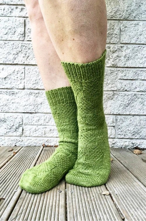 These very textured unisex socks are knitted in the round, from the toe up, with a clever design worked simply with knit and purl stitches to create an intricate texture. This pattern is written for three sizes. The beauty of knitting from the toe up is that you can choose how long you’d like your socks to be.
