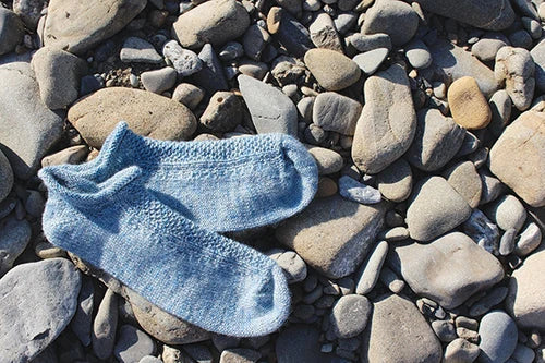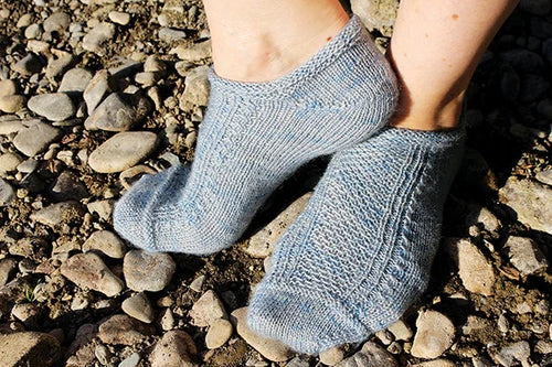 Orari River Socks are a toe-up unisex ankle sock featuring a gorgeous and simple slipped stitch and cable pattern up the middle of the instep, combined with plenty of stocking stitch to keep it a quick knit.
