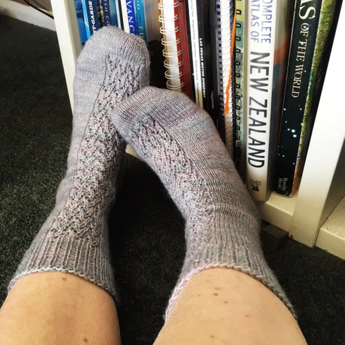 Rangitata Socks use a lace pattern that echoes the pattern the river makes as it flows apart then comes back together to form the braids that make the river such a spectacle from above. The lace braids on these socks run up one side of the foot and there’s another wee narrow iteration running up the outside back of the leg.
