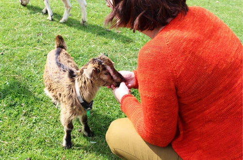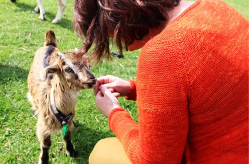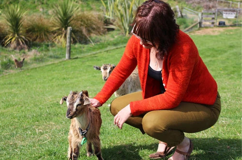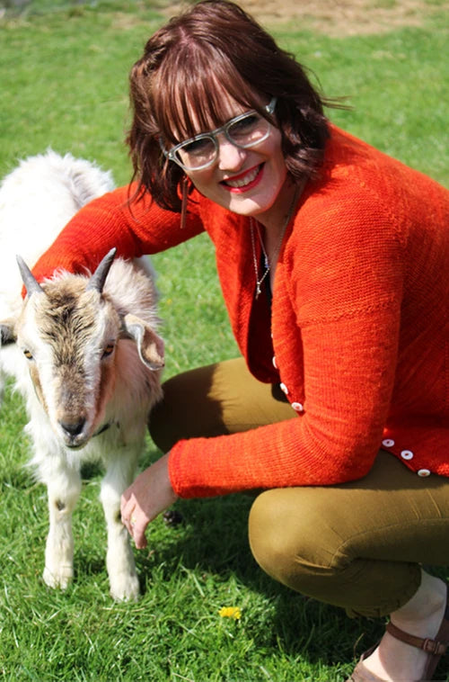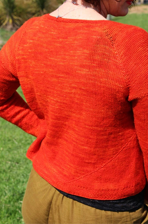 You’ll start knitting at the neckline and increase for raglan sleeves, with a little reverse stocking stitch at your shoulders, then when you get partway through the body, you’ll begin the panel at the sides and you’ll create a flattering detail of reverse stocking stitch to match your shoulder details. The cuffs, button bands and neck band are worked in pretty moss stitch.