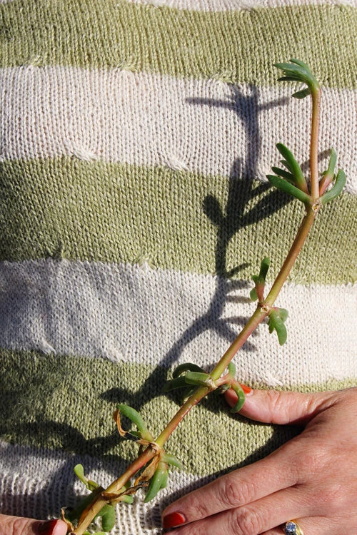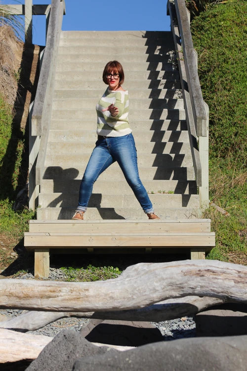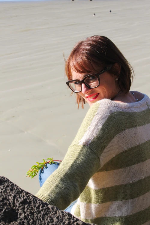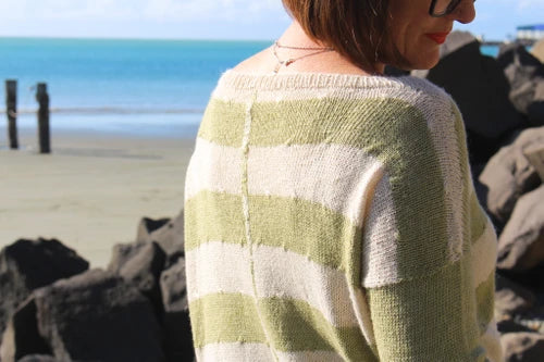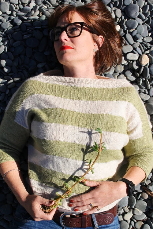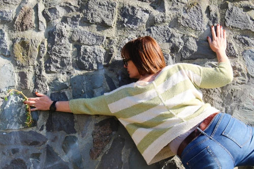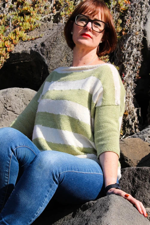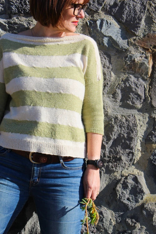 Sumner Pullover is just the kind of garment that fits in that picture. Easy to wear, with its cropped relaxed fit and mid length sleeve, with enough detail in the stripes, the wee cables and the combined stitches running down the back to dress it up for dinner.