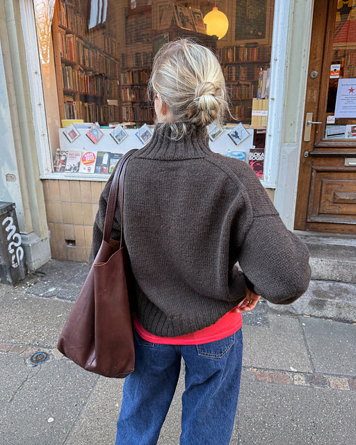 The Hannah Sweater O-neck is worked from the top down. First, the back yoke is worked back and forth on the needle with increases. The shoulders and then the front yoke is worked from stitches that are picked up and knitted along the back yoke. The sleeves are worked from stitches that are picked up and knitted along the armhole openings. At the end, stitches are picked up and knitted along the neck opening, and a double rib edge is worked.