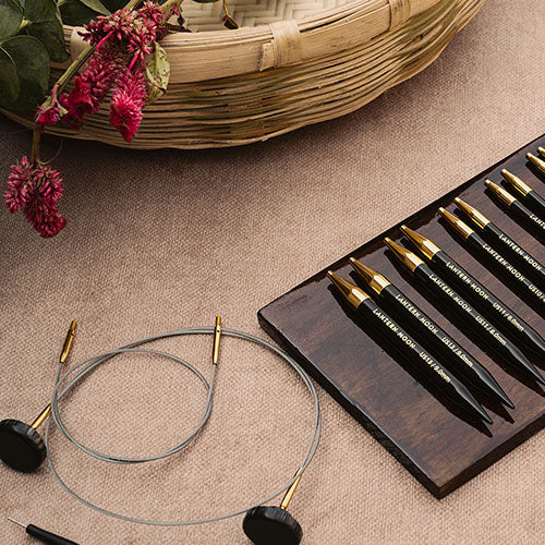 Lantern Moon's interchangeable circular knitting needles are made of Ebony wood, one of the world's most valuable materials. The liquid silk finish of these lightweight interchangeable circular needles and the 24K finish on the brass connector, guarantees snag-free knitting. The interchangeable circular needle's smooth cord never twists thanks to a swivel connector, and it lies flat for easy storage. Smoothly honed and shaped needle tips work well with all yarns.
