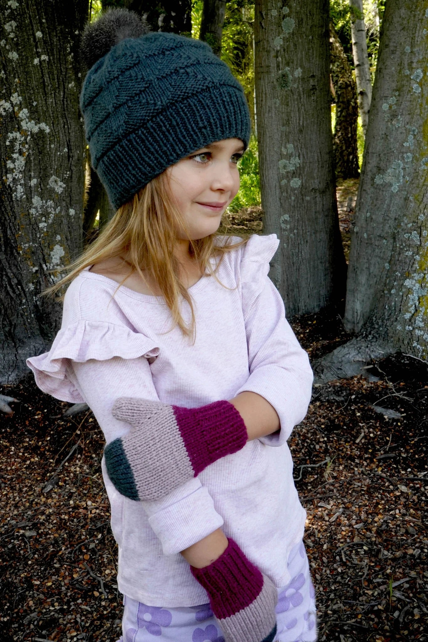 Stay warm and stylish all winter long with the Sunday Hat and Mittens. The hat features a textured triangle pattern and paired with the mittens knitted in bold colour blocks for a fun and playful look.