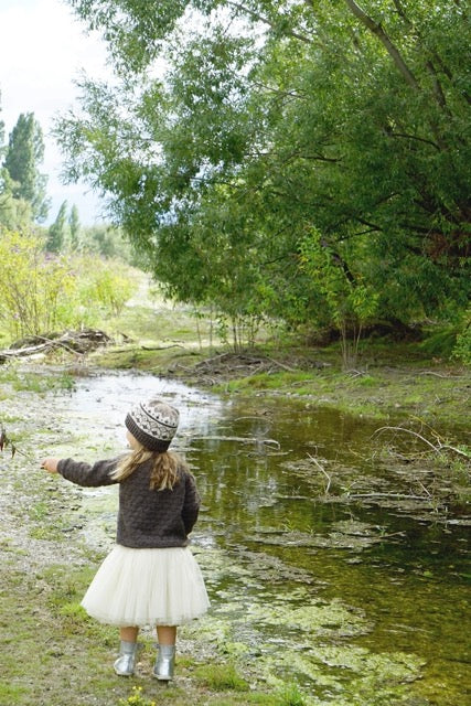 A crew neck textured sweater featuring a garter stitch details. Teamed up with a fairisle beanie.
