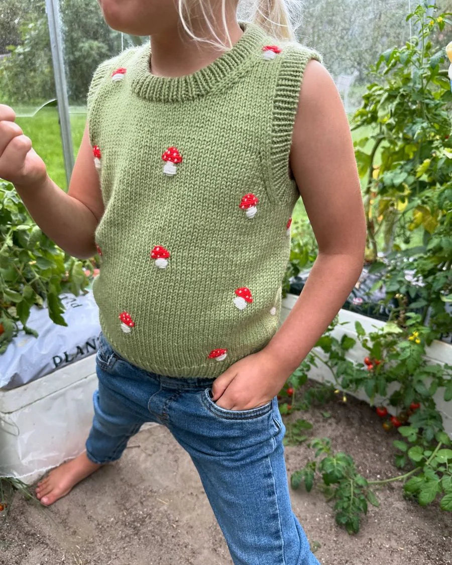 The green Novice Slipover Junior is knitted in Double Sunday by Sandnes Garn in the color Almond [2511]. The mushrooms are embroidered with Sunday by Sandnes Garn in the colors Whipped cream [1012] and Poppy [4008]. Note, the pattern does not include instructions for embroidery.