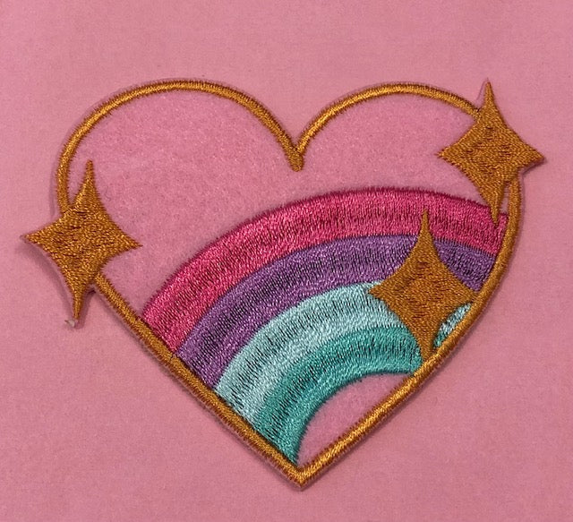 Embroidered Rainbow Heart iron-on Patch. Perfect for adorning bags, crafts, clothes.