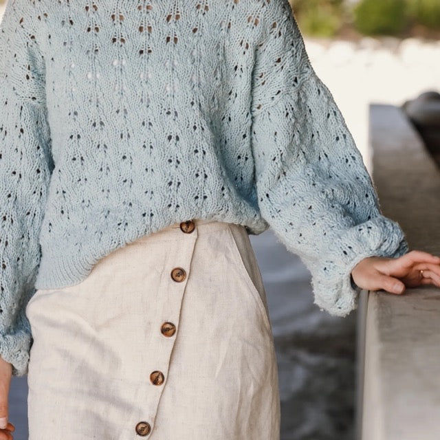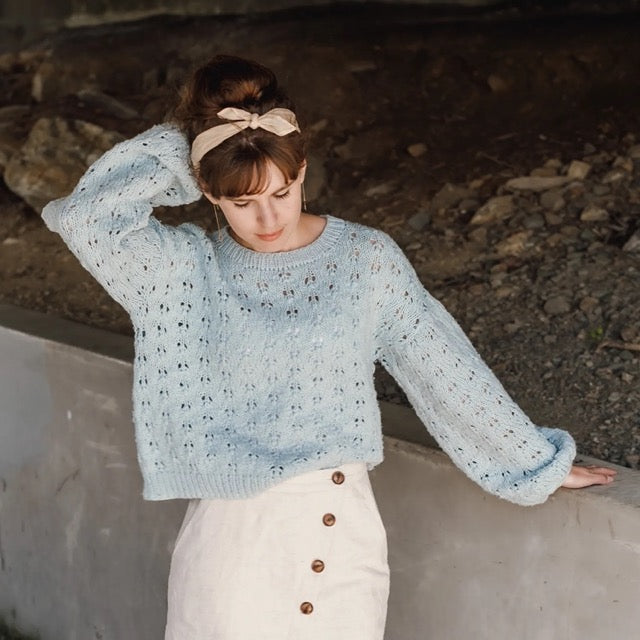 This design was inspired during the ongoing Covid outbreak in 2021. At the time, the world felt like a harsh, tense place and I wanted to feel cosy and cocooned. So I created this sweater with thick, squishy yarn for a cosy embrace, delicate lace to counteract the harshness of the world, balloon sleeves for a sense of indulgence and a cropped, oversized fit for easy wear. This project brought me calm during a wild time and I hope that as you knit and wear this sweater, that it does the same for you.