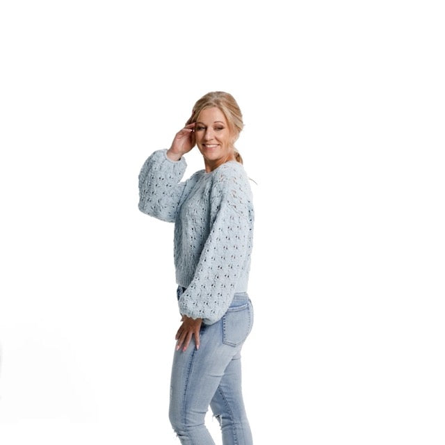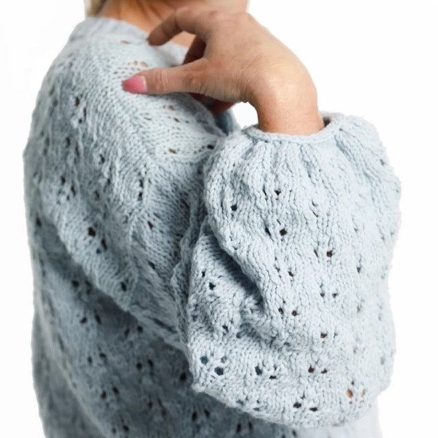 Embrace texture with the Holey Moley Sweater. Features all over eyelet stitches, drop shoulders, crop length, volumes sleeves and balloon cuffs. Uses top down construction for a seamless finish and short rows at the shoulders for shaping.