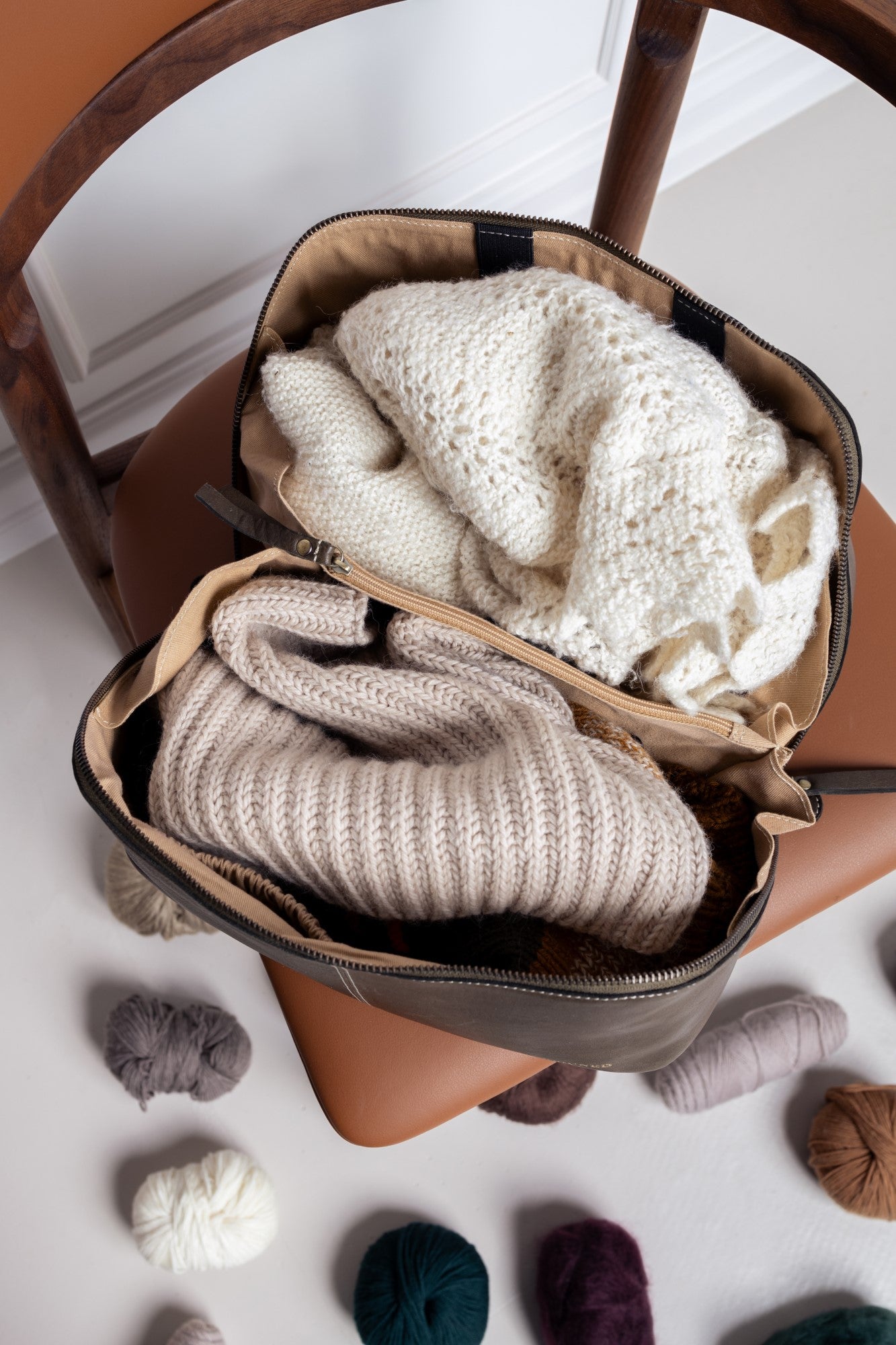 • Featuring a dedicated section for knitting tools (such as scissors, stitch markers, and needles)