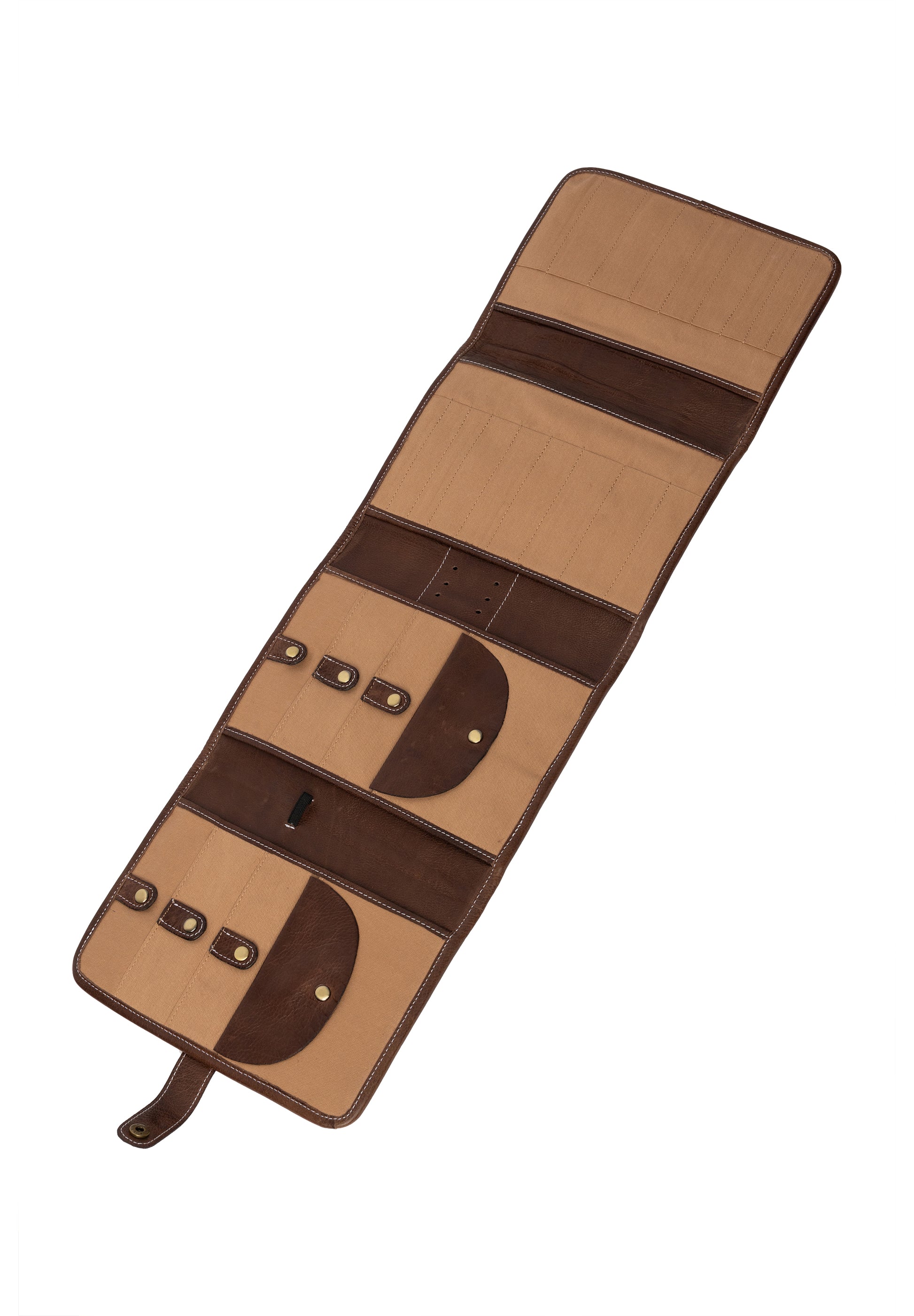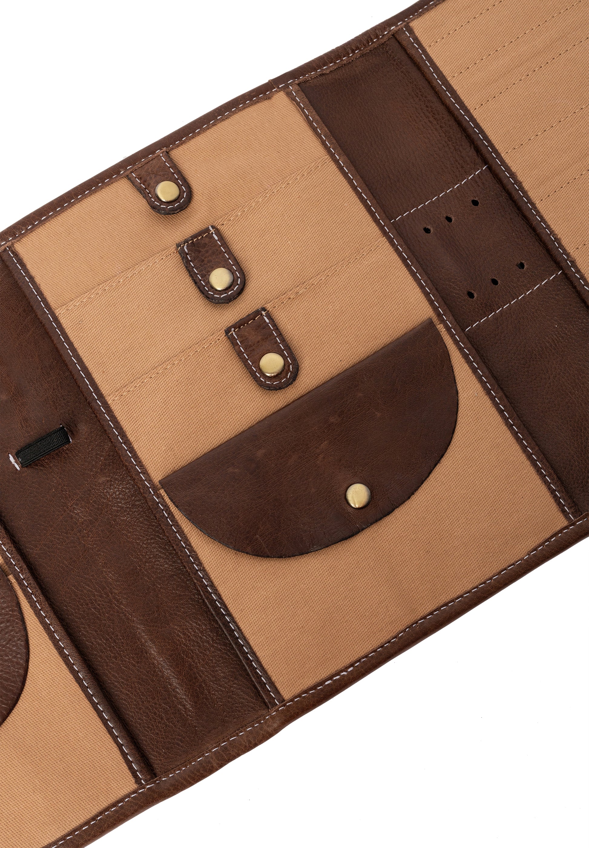 It has so many pockets, compartments and other fabulous features where you can store your needles, hooks, scissors, measuring tape and more. Handmade from beautifully soft leather, this is a gorgeous case to keep all your notions and accessories. The entire needle case elegantly folds together and fastens with a snap, making it easy to carry your essential knitting tools. It's 18cm wide when closed and 70cm when opened up.