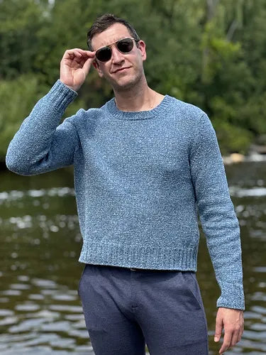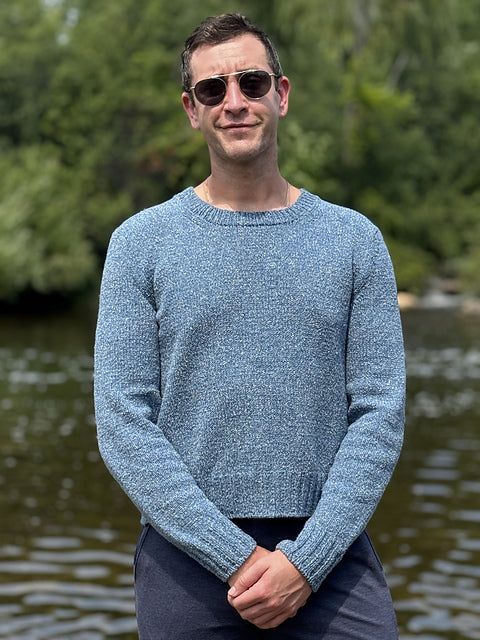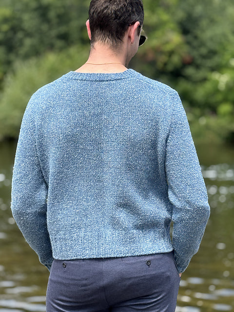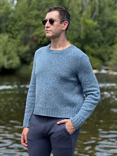 There is a choice of a standard shoulder where the seam rests at the middle of the shoulder cap or a French Shoulder. The French shoulder sits farther back and can be a great fit adjustment for those who find pullovers ride up in the centre back. The finishing and amount of knitting are the exact same.